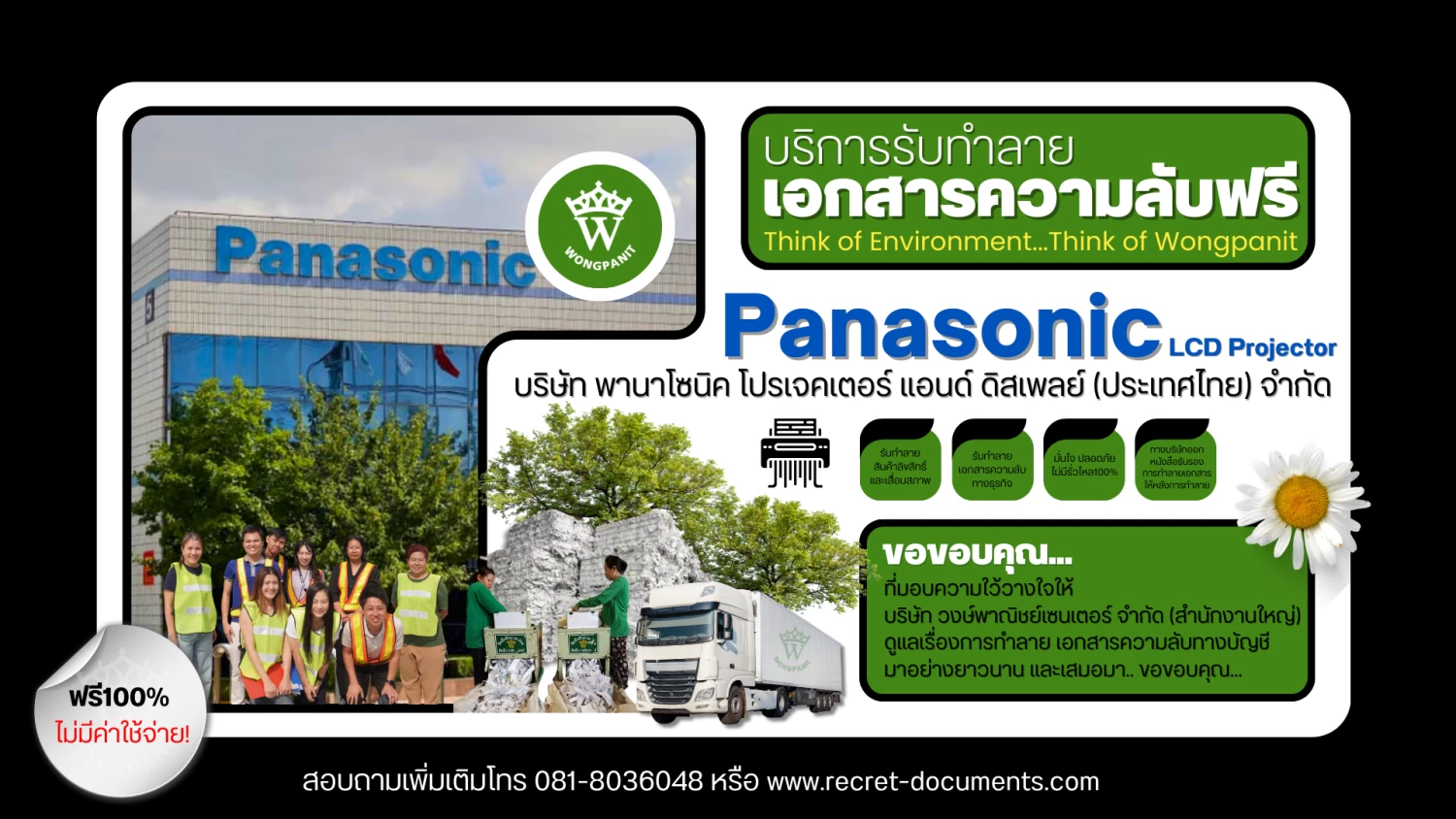 ☢️ บริการรับทำลายเอกสารความลับ และ สินค้าลิขสิทธิ์และสินค้าเสื่อมสภาพ ฟรี!♻️ บริษัท วงษ์พาณิชย์ เซนเตอร์ จำกัด เป็นผู้ดำเนินการรับทำลายเอกสารความลับ ให้กับ...บริษัท พานาโซนิค โปรเจคเตอร์ แอนด์ ดิสเพลย์ (ประเทศไทย) จำกัด ประจำปี 2569 🙏🏻ขอขอบคุณ ที่มอบความใว้วางใจให้ บริษัท วงษ์พาณิชย์เซนเตอร์ จำกัด (สำนักงานใหญ่) ดูแลเรื่องการทำลายสินค้าลิขสิทธิ์และเสื่อมสภาพ มาอย่างยาวนาน และเสมอมา..